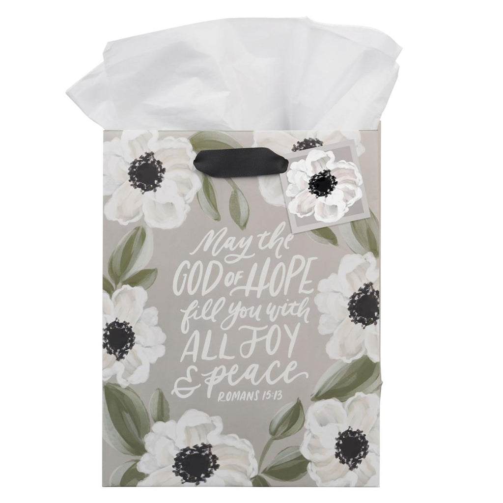 Encourage a heart in need with the God of Hope Gray Floral Medium Gift Bag, a beautiful way to bring light, joy, and peace to someone you care for.