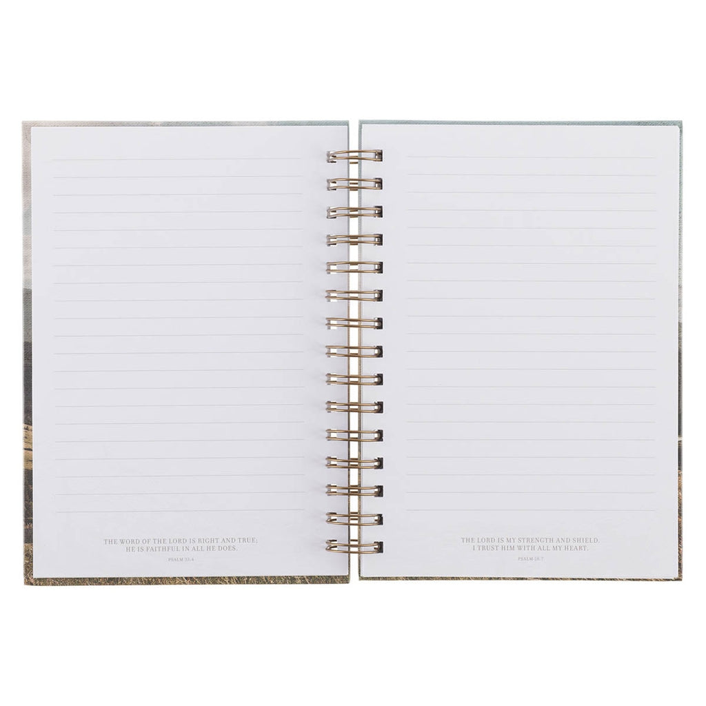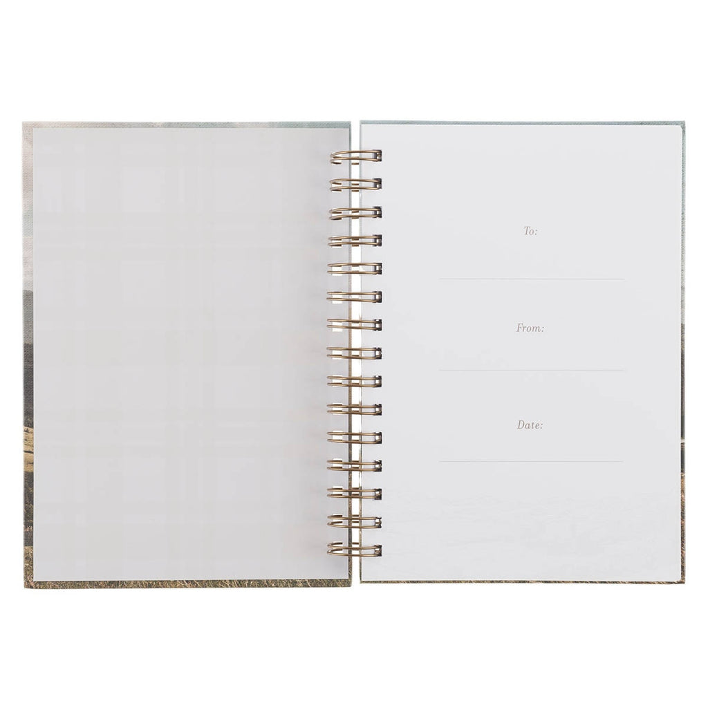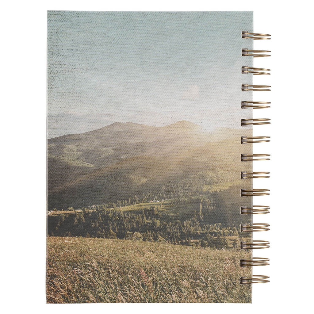 The peaceful pastoral mountain setting wraps to the back cover, tying the design together with continuity and calm. A sturdy gold metal spiral binding allows the journal to open flat for easy writing. With 192 lined pages, this journal weaves Scripture into every entry by placing a meaningful Bible verse at the bottom of each page.