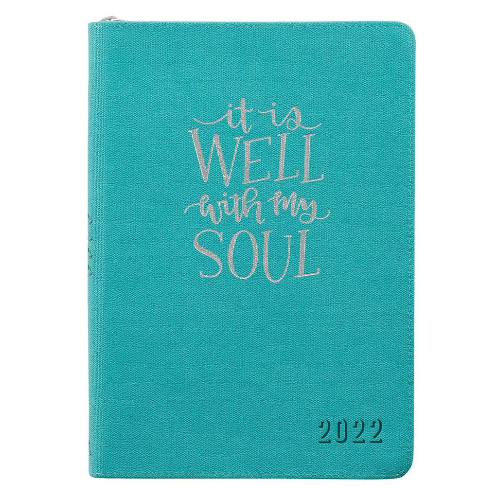 Take a deep breath and take on the world when you plan your days using the It Is Well With My Soul Teal Faux Leather 2022 Executive Planner. This 12-month planner, with its zippered closure and positive message, will see you through the year's ups and downs.