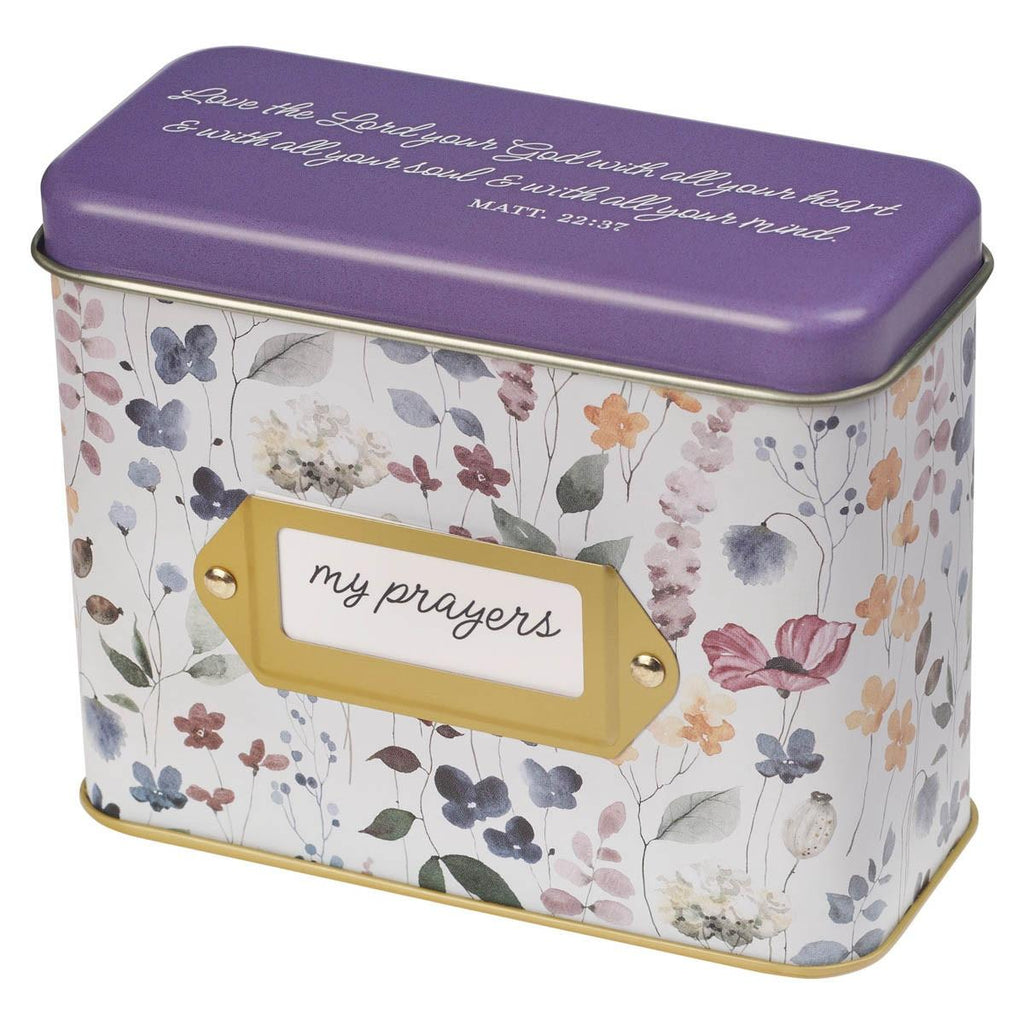 A beautiful wildflower design decorates the exterior of the brass metal tin. A white label in the brass label holder on the front of the tin states, "My Prayers." The hinged purple lid features a Scripture verse in white scripted letters.