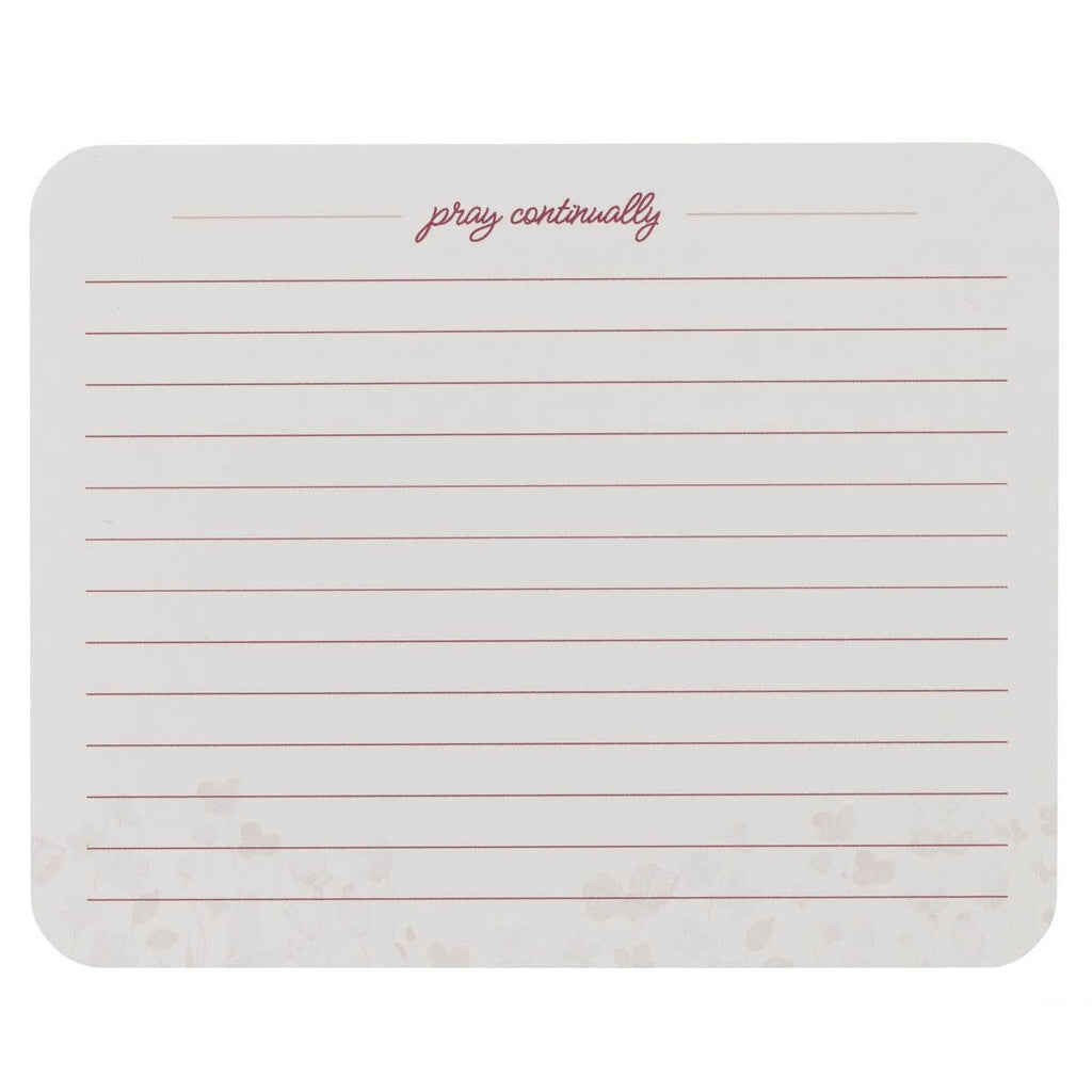 The tin holds 50 double-sided lilac-colored laminated cards. Each card is decorated with a tone-on-tone lilac wildflower design. Prayer is featured on the front of each card, and lined space on the back allows you to add a note or your own prayer.