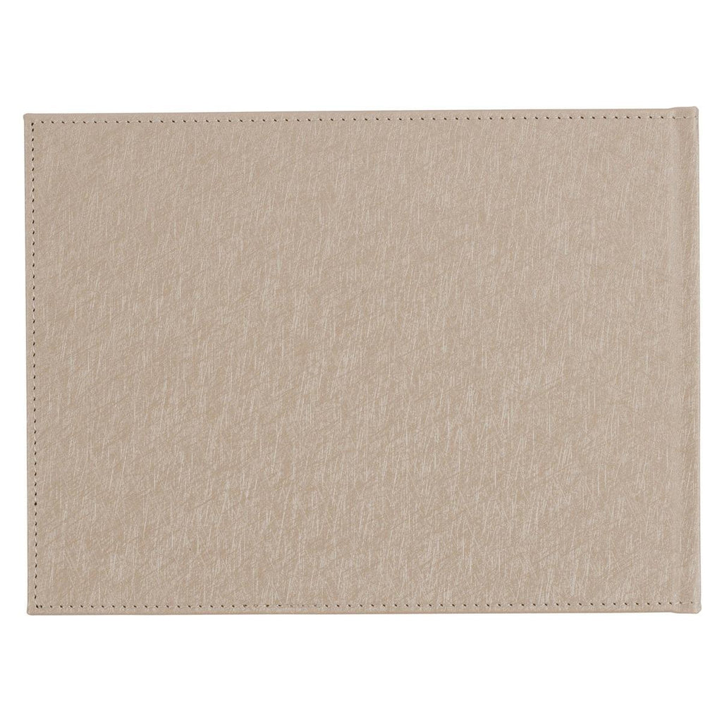 Lightly texturized pearlized faux leather connects to the floral panel with a double row of topstitching. It then wraps over the spine and continues on the back cover of the guest book.