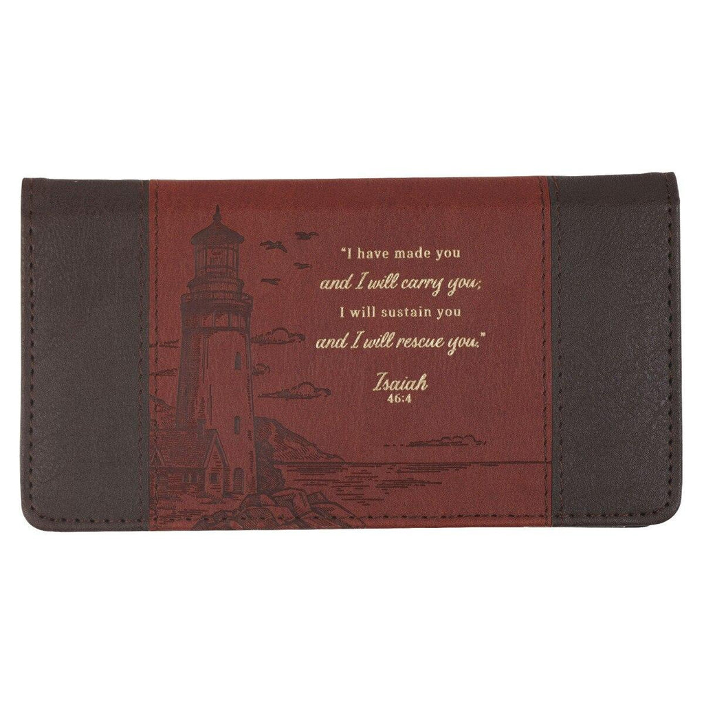 The checkbook wallet is constructed with two walnut brown horizontal panels that flank a rich, brick-red faux leather panel. The center panel is heat-debossed with a majestic lighthouse design and features a Scripture verse in gold foiled lettering.