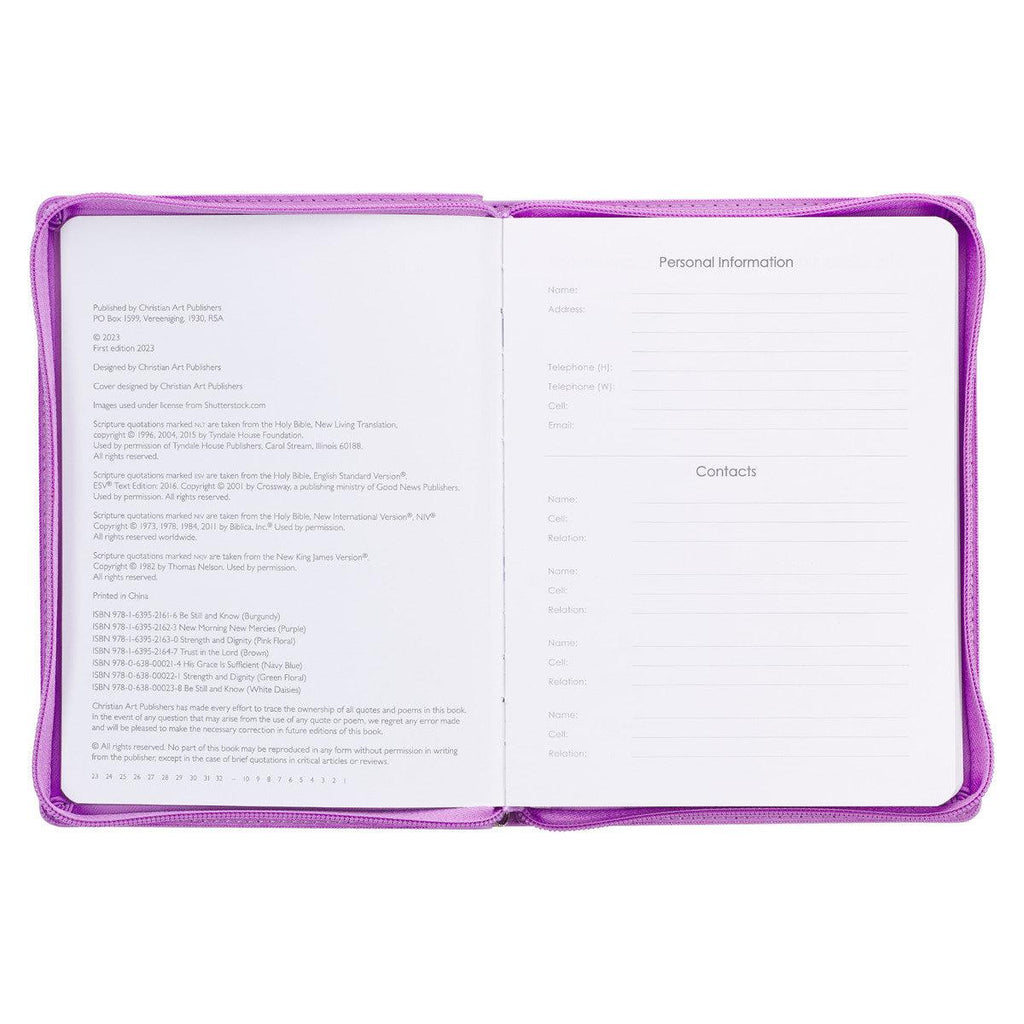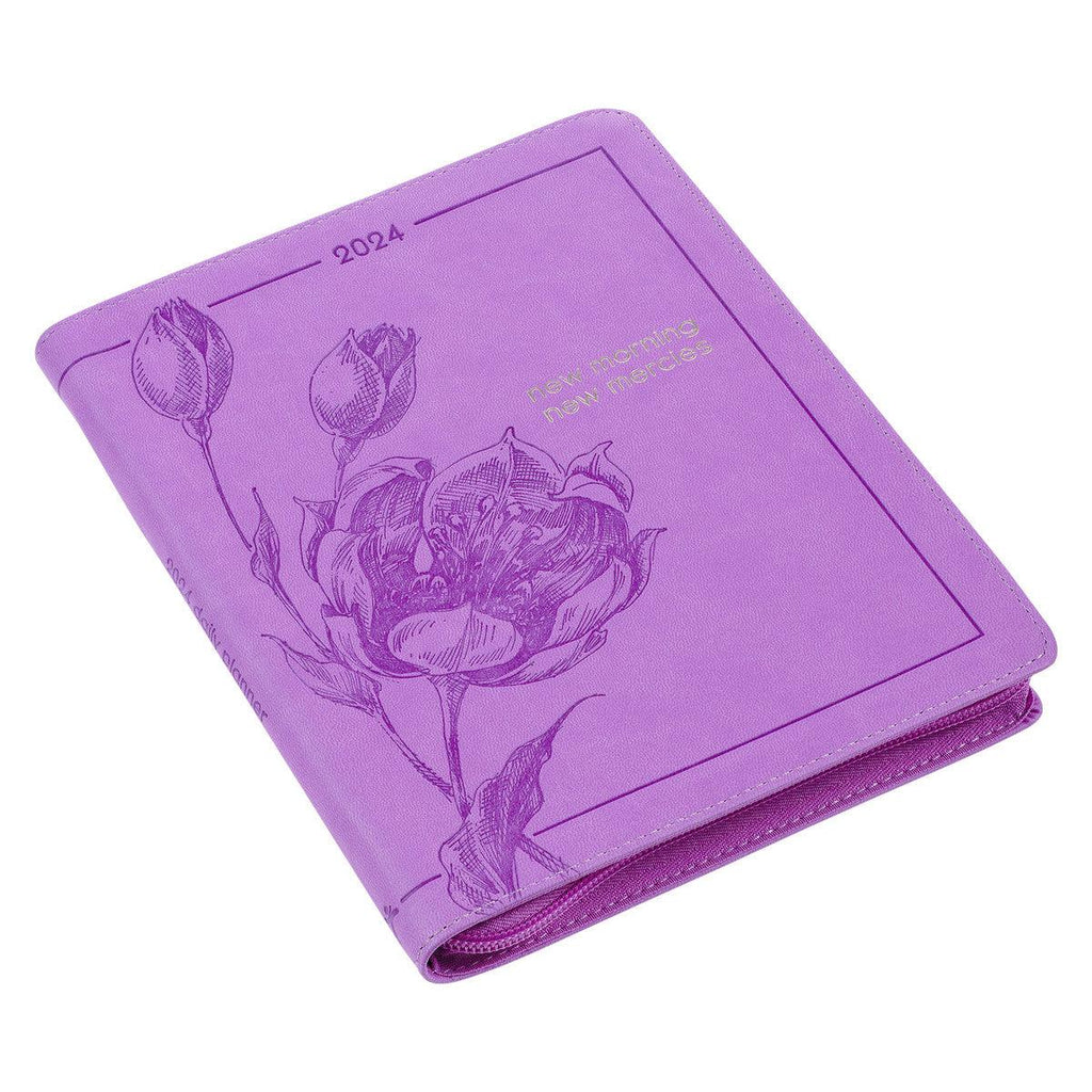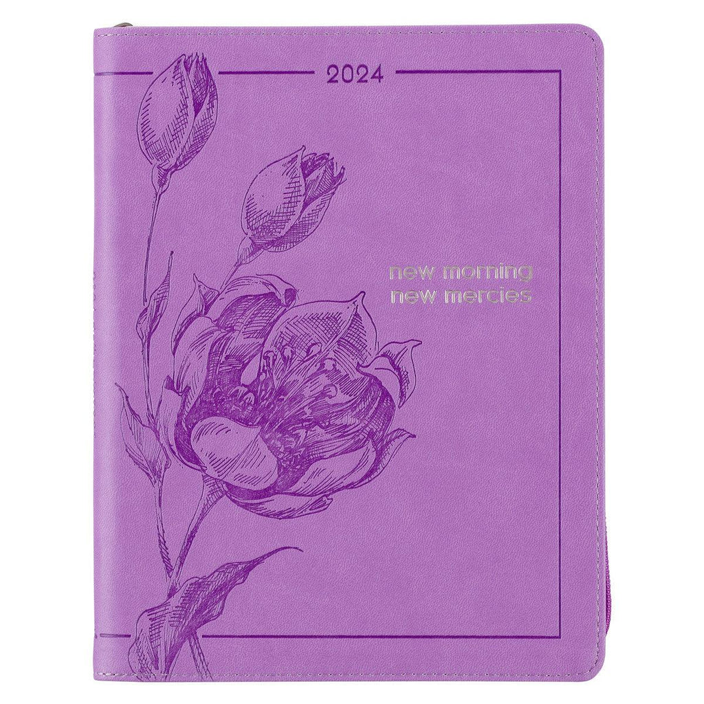 Plan the first day of the rest of your life with the2024 New Day New Mercies Purple Faux Leather 18-Month Planner for Women, and remember that with God's strength, you can overcome anything.