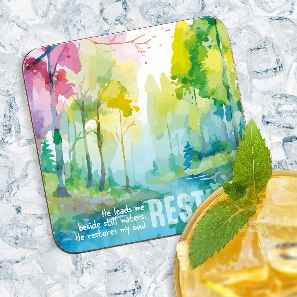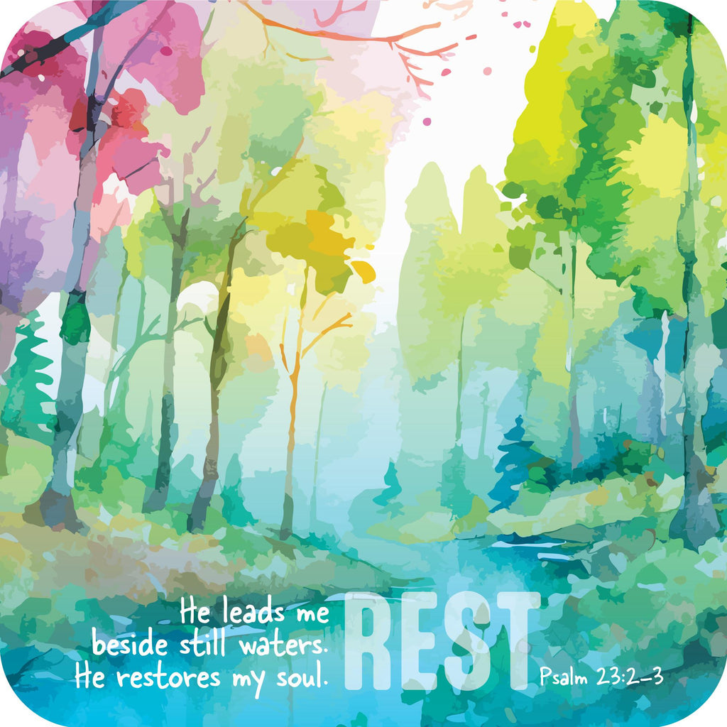 Wording on coaster: ‘Rest. He leads me beside still waters. He restores my soul.’- Psalm 23:2-3