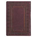 The spine of this Bible is adorned with additional heat-debossed Greek-themed fern and scroll designs, gracefully interspersed with four sets of gold-foiled faux spine ribs. The title is also elegantly presented in gold-foiled letters, adding a touch of sophistication to this remarkable piece.