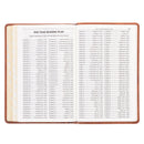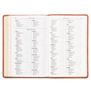 This Bible's rich honey-brown faux leather cover features a handsome heat-debossed design, showcasing a gracefully understated Celtic cross encased within a heat-debossed frame to create a reverent feel. The title is heat-debossed on the spine and flanked by two heat-debossed faux spine ribs.