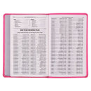 Experience the convenience of the Bible's lay-flat spine that allows it to open and lie flat on any surface. A charming pink presentation page is perfect for inscribing names and a date to mark a special occasion. Despite its lightweight and thin profile, this Bible features a small but legible 8-point type, presented in a double-column format, and includes the entire KJV text, a helpful thematic Scripture verse finder, and a comprehensive one-year Bible reading plan.