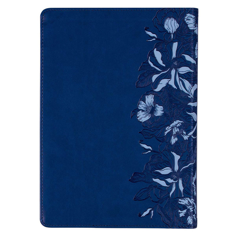 The spine of the navy blue faux leather Bible is embellished with a heat-debossed outline of a creeping clematis. Light blue accents are added to the petals to create depth. The title is presented in clear silver foiled letters.