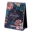 Display the 2022 Everything Beautiful Desktop Calendar on a desk, nightstand, bookshelf, kitchen counter, or coffee table. The cardboard backing folds out to help the calendar stand upright, and wire binding makes it easy to flip between months.