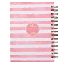 This hardcover spiral bound journal has a fun-filled cover with printed pink stripes and randomly placed debossed dots that are accented with gold foiling. Each 192 lined pages includes a Scripture verse. This delightful large hardcover journal will make a coveted gift as part of baby shower gift for any new mom to write her prayers and blessings for her new baby. Pair this wire bound journal with a glass water bottle to keep the new mom hydrated in style.