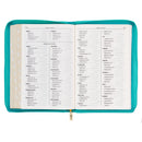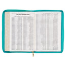 The Vibrant Teal Faux Leather Large Print Thinline King James Version Bible with Zippered Closure and Thumb Index is the perfect blend of style and convenience. This beautiful Bible offers the timeless beauty of the KJV text with the practicality of a Thinline format, thumb indexing, and a zippered closure.