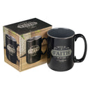 The glossy black exterior of the mug contrasts well with its matte gray interior. The same gray accent is used as a frame to highlight part of the sentiment that is presented in silver-foiled letters accented by framed black block letters.