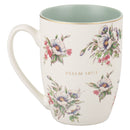 Delicate pink and blue flowers bloom lively against the serene white backdrop of the mug, creating a captivating visual feast. Encircled by a charming gold-foiled dotted frame, the heartfelt sentiment takes center stage, beautifully presented in a shimmering gold-foiled font.
