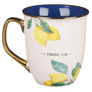 The white ceramic mug is decorated with bunches of yellow lemons that dangle from the top and rise from its base. The sentiment is screen-printed on the front of the mug in blue scripted letters.