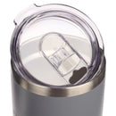 The gray exterior is framed by two stainless steel bands—one at the top and another at the bottom. The interior is double-wall insulated and will keep your drink at a steady temperature for at least 24 hours —a perfect way to stay hydrated during the day. Leave the mug on any surface without worrying about water stains because the double-wall insulation keeps condensation from forming on the outside of the travel mug. A clear plastic lid with a silicone ring fits snuggly into the mouth of the mug, and a retractable sip hole cover with a raised edge prevents any spills or leaks. The stainless steel travel mug holds 18- fluid ounces.