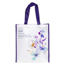 The Hebrews 11:1 Tote Bag has a durable, non-woven polypropylene material that includes convenient purple carry handles for easy transporting to and from home, school, or the gym. Hebrews 11:1 is featured on the front of the Christian tote bag with a beautiful watercolor and pastel floral design below the hopeful verse.