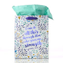 This beautiful gift bag from the Positively Purple Collection features a calico design with bright yellow flowers and leaves and stems in shades of green and purple etched against a light background. The message from Philippians 3:13, " I can do all this through Him who gives me strength," is scripted in a casual purple font. A contrasting purple gift tag with a subtle leaf imprint adds visual interest.