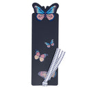 The premium cardstock bookmark features a matte black background with fluttering butterflies. UV varnish adds shimmer to the pink and blue butterflies. The sentiment is printed in white and flowing blue foiled lettering.