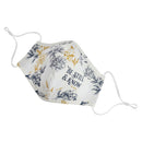 The front of the soft cream-colored cotton mask is printed with flower illustrations in gray and gold. The sentiment is displayed in strong gray lettering on the left side of the mask, and the Scripture reference is printed in gold.