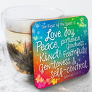 Wording on coaster: ‘The fruit of the spirit is Love, Joy, Peace, Patience, Goodness, Kindness, Faithfulness, Gentleness and self-control ‘ – Galatians 5:22-23 (ESV)