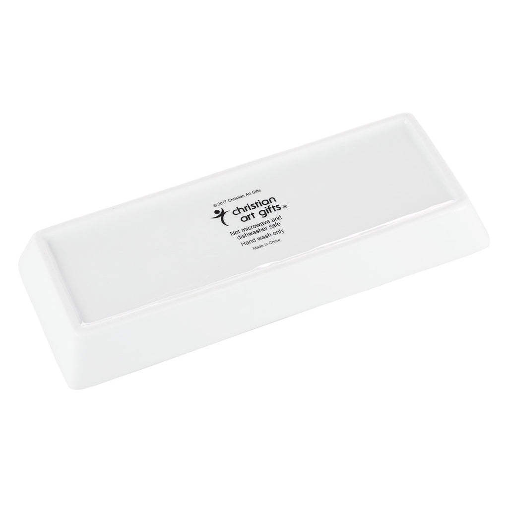 This trinket tray features a section for him, her and a middle square to share, making it a perfect gift for newlyweds. The sections on the right and left boldly display “Mr” and “Mrs” in elegant gold lettering while the middle section displays the verse from 1 Peter 1:22, “Love one another deeply,” as an encouragement and reminder to the couple to love their spouse daily.