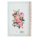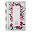 The Love Is Wirebound Notebook features 128 lined pages, spiral binding, and a PVC cover with a lovely watercolor design of vibrant pink and blush flowers surrounding the text from 1 Corinthians 13:4–8. Subtle foiled accents are added to the cover of this wirebound notebook cover .