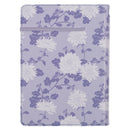The journal showcases a faux leather cover with two beautiful matching designs. Starting from the back cover, an elegant pattern of white flowers with dark purple leaves gracefully unfolds against a serene light purple backdrop, wrapping around the spine to meet a solid purple panel on the front. Seamlessly connecting these two panels, a double row of delicate light blue topstitching adds a refined touch. The sentiment takes center stage in alternating heat-debossed and silver-foiled script on the solid purple panel, and this eye-catching display is further enhanced by a curving heat-debossed motif that frames the sentiment on both the top and bottom, adding an elegant flourish.