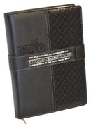 This black leather journal with black diamond plate pattern has a debossed motorcycle design and a silver-tone plaque on the closure band with Ride in Triumph engraved. It includes a sewn-in bookmark and 176 lined interior pages. It also features an embossed Scripture verse -You will find your joy in the Lord and on the heights of the land - Isaiah 58:14.