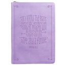 This zipped closure flexcover journal features Scripture from Jeremiah 29:11 debossed onto the soft lilac front cover, and a simple debossed border. There is an attached ribbon page marker. The journal cover is constructed of quality man-made material imported from Italy, with the look and feel of real leather (trade name LuxLeather).