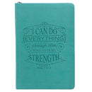 This zipped closure flexcover journal features Scripture from Philippians 4:13, "I can do everything through Him who gives me strength," beautifully scripted in debossed text. The trendy turquoise cover is both eye catching and elegant and the text reminds us that through Christ we can be content in all seasons of life. There is an attached ribbon page marker. The journal cover is constructed of quality man-made material imported from Italy, with the look and feel of real leather (trade name LuxLeather).