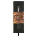The handsome pen comes packaged in a gift box with a slide-out tray and black ribbon pull. The box is o-wrapped with a label featuring a woodgrain background and the verse pictured as a typographical design.