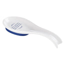 The white ceramic spoon rest comes with a removable blue silicone base and is both dishwasher and microwave safe. Printed in blue at the center of the spoon rest’s shallow bowl is the message: