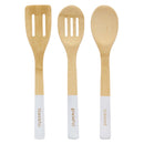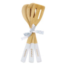 The handles of the bamboo spoons are dipped in white paint, and then laser engraved with the sentiments. The set consists of a spoon, slotted spoon and slotted spatula. A gray plaid ribbon ties the set together.