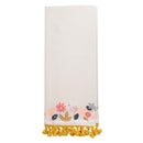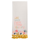 The cotton tea towel is made from natural-colored cotton. A row of vibrantly colored flowers grace the top and bottom hems of the towel and is accented with a strip of yellow crocheted tassels. The sentiment, taken from Ecclesiastes 3:11, is printed in a collection of vibrantly colored letters.
