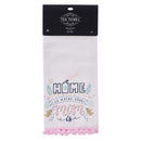 The cotton tea towel is colored off-white and printed with a playful pattern of ferns, banners, flowers, and other adorable additions in soft pastel colors. The sentiment is written in a fun and creative style and is accented by a strip of small baby-pink pom-poms along the bottom hem.