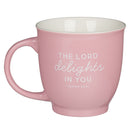 A Scripture verse is captured in a white multi-font design on the back of the pink ceramic mug.