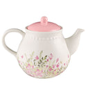 The classic round belly teapot is elegantly decorated with dainty pink florals and green foliage that encircles its base. On the front, a sentiment is depicted in pink lettering.