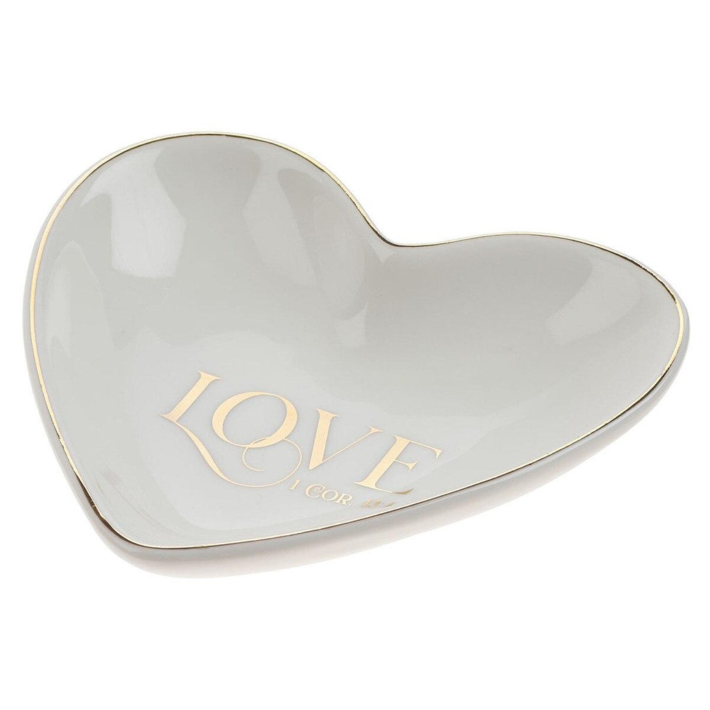 The creamy white ceramic tray features a soft, glossy finish and is accented with a delicate gold-foiled rim that outlines its heart-shaped design. The sentiment is displayed in gold-foiled letters in the center.