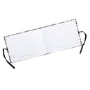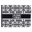 This guest book for a memorial or funeral commemorates a life, and celebrates the memory of the other lives they touched. The cover has a black flocked design over silver, trimmed in silken black and finished with a silver foiled center overlay. A black ribbon creates the closure.