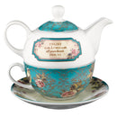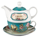 This tea for one teapot and teacup set features Scripture from Proverbs 3:5 and a design of soft amber and aqua backgrounds with gold filigree. A pair of small golden finches perched on a branch of cherry blossoms. The appealingly shaped and designed individual-sized teapot that stacks into its own teacup will delight anyone. Scripture from Proverbs 3:5 is also featured on the back of the teapot. The teapot lid has a hole for steam release.