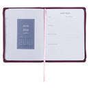 The daily planner's burgundy faux leather cover is heat-debossed with a continuous rose design that creeps all around the smooth frame that is set in the middle. The frame is edged by a rose god-foiled border and features the sentiment in rose gold letters. The year is indicated in small numbers in the top right corner of the front cover.
