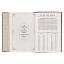 The front cover of this toffee brown faux leather Study Bible features a beautifully heat-debossed ivy art nouveau design that elegantly frames the title. The gold-foiled title and version reference add a touch of sophistication to the front cover.