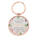 Floral pastel pinks and dark greens embellish this key ring and matching gift tin. A floral arrangement surrounds the Scripture verse, which includes two font styles, making it stand out. Perfect for Mother’s Day, birthdays, and friendship gifts, this key ring pairs nicely with anything from the Heart Collection.