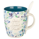 Celebrate the faith of a friend, mentor, or new believer when you wrap the Saved by Grace Blue Floral Ceramic Coffee Mug with Spoon paired with a Bible or journal as an encouraging gift.