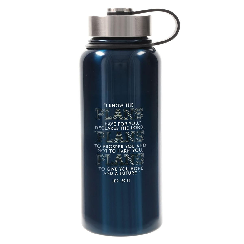 Take The Plans Navy Blue Stainless Steel Water Bottle to class, the office, or the gym. It will keep you refreshed and grounded in truth and be a daily reminder that God's plans for your life are full of hope and promise.
