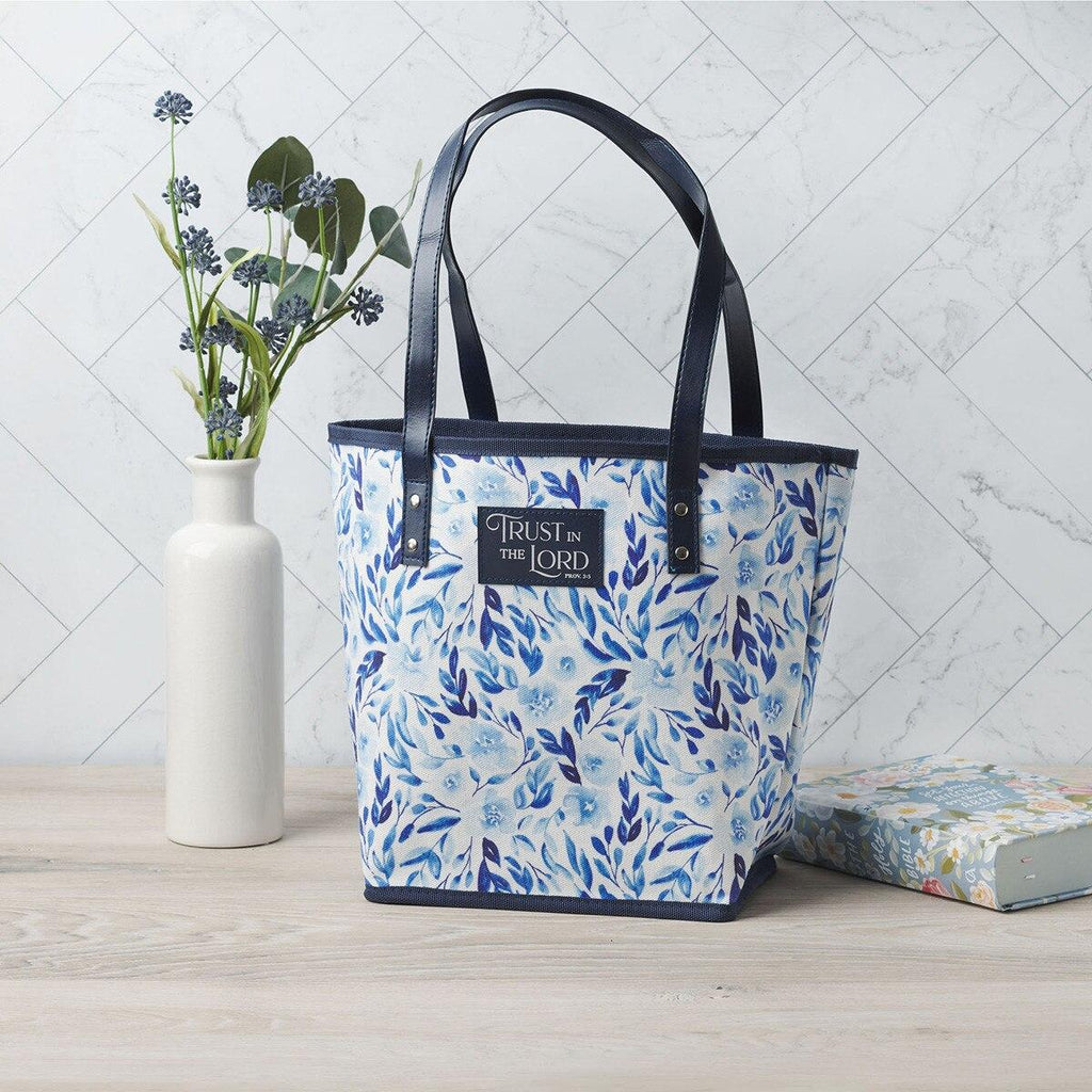 The Trust Blue Botany Canvas Tote Bag is part of the Trust in the Lord Blue Botany Collection that includes a canvas tote bag, travel tumbler, faux leather Bible case, faux leather checkbook wallet, and a faux leather bookmark.
