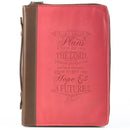 A milk chocolate brown back cover wraps around the spine of the faux leather Bible cover. Stylized text from Jeremiah 29:11 is heat debossed onto the front pink panel.