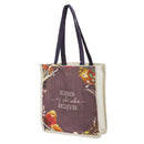on both sides against a royal purple background. The printed cover is also rimmed by colorful birds and floral accents. White side panels add an extra depth of attraction. Made of cotton canvas, the tote also has sturdy stitched handles for durability. Truly ready to grab and go!
