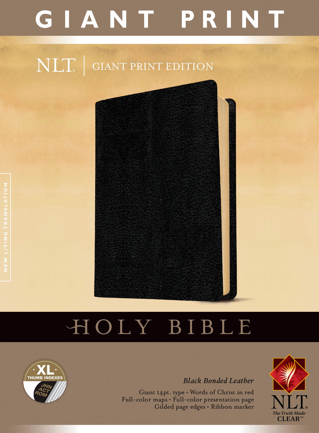The easy-to-read, giant-print New Living Translation Bible is perfect for readers preferring a larger font. It has a 14-point font size, words of Christ in red, 16 pages of full-color maps, ribbon marker, gilded page edges, and a presentation page. This edition features a quality black bonded leather binding and a thumb index.